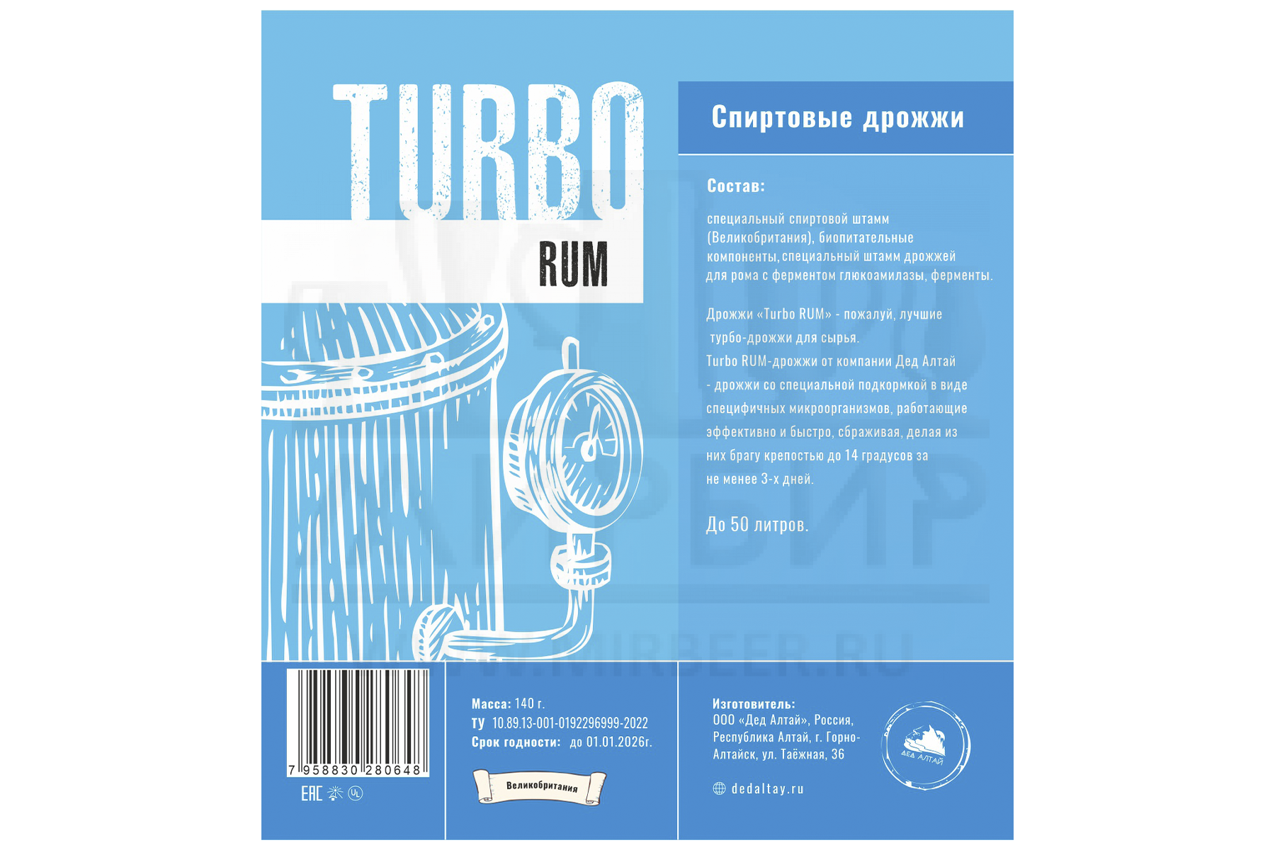 Состав: специальный спиртовой штамм (Великобритания), биопитательные компоненты, специальный штамм дрожжей для рома с ферментом глюкоамилазы, ферменты.